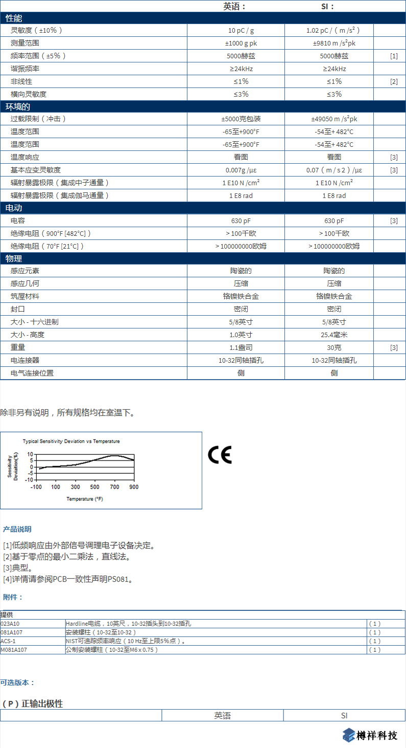 高溫,陶瓷壓縮,電荷輸出加速,10 pC / g,5kHz,10-32側(cè)連接。(-65°F至+ 900°F),配有10英尺硬線電纜靈敏度:(±10%)10 pC / g(1.02 pC /(m /s2))測量范圍:±1000 g pk(±9810 m /s2pk)頻率范圍:(±5%)5000 Hz重量:1.1盎司(30克)