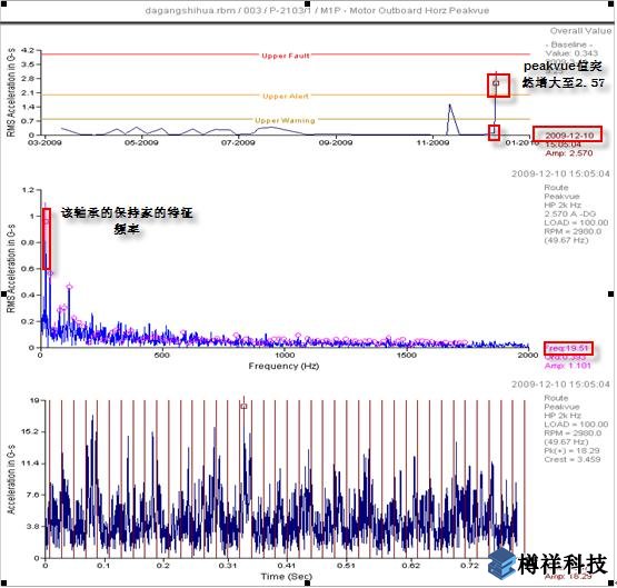 圖1:電機(jī)后軸承位置Peakvue值趨勢(shì)、頻譜及時(shí)域單峰波形