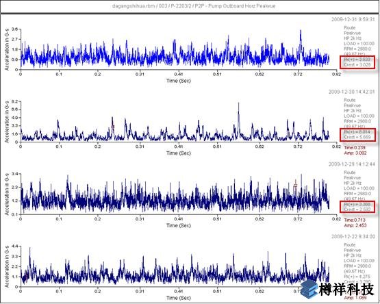 2009年12月30日監(jiān)測(cè)時(shí)發(fā)現(xiàn)三聯(lián)合P-2203/2泵側(cè)出口端軸承波形上但突然出現(xiàn)沖擊信號(hào),Peakvue值突然增大,從0.4到0.7,沖擊幅值從3突然漲到8,呈現(xiàn)明顯的沖擊,但振動(dòng)基本無(wú)變化,如下圖所示