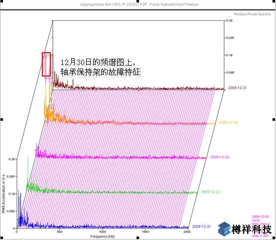 判斷為該泵電機(jī)遠(yuǎn)端軸承保持架磨損,顯示出保持架有損壞,測(cè)試中有沖擊,現(xiàn)場(chǎng)聽(tīng)到明顯雜音,建議車間停泵修理。