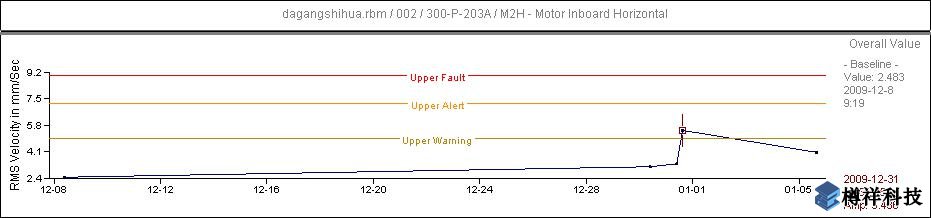 2009年12月31日,監(jiān)測(cè)發(fā)現(xiàn)二聯(lián)合車間泵300-P-203A的電機(jī)靠聯(lián)軸器側(cè)的振動(dòng)有明顯的增長(zhǎng)趨勢(shì),且伴有軸承雜音,泵側(cè)振動(dòng)基本無(wú)變化。