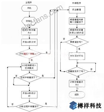 開機(jī)后,先進(jìn)行初始化,包括對單片機(jī)的初始化、LCD的初始化和其他模塊的初始化。出于省電的考慮在40s內(nèi)若沒有鍵按下,讓單片機(jī)的LCD控制器進(jìn)入空閑模式。用“for”循環(huán)來計時,并設(shè)計初值為零。