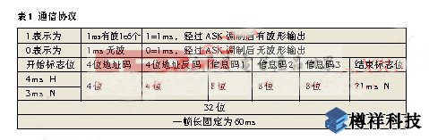 如表1所示,各部分碼的作用:引導(dǎo)碼用來通知接收器其后為遙控數(shù)據(jù)。地址碼用來區(qū)分是哪一機(jī)型的數(shù)據(jù),接收端據(jù)此來判斷后續(xù)的數(shù)據(jù)是否為本機(jī)必須執(zhí)行的指令。信息碼用來區(qū)分是哪一個鍵被按下,接收端接受信息碼的數(shù)據(jù)并據(jù)此做出應(yīng)該執(zhí)行什么動作的判斷。信息碼也包括在持續(xù)按鍵時發(fā)送的連續(xù)碼。它告知接收端,某鍵是在被連續(xù)地按著。結(jié)束碼用來通知接收器一幀數(shù)據(jù)發(fā)送完畢。