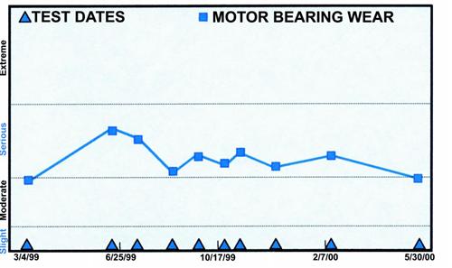 嚴(yán)重程度評(píng)分的趨勢(shì)是機(jī)器健康狀況的良好指標(biāo)。對(duì)于每個(gè)診斷規(guī)則模板,嚴(yán)重性分?jǐn)?shù)將映射到嚴(yán)重性等級(jí),包括輕微,中度,嚴(yán)重和極端。用于確定嚴(yán)重性的算法是基于由振動(dòng)專***手動(dòng)分析的大量測(cè)試結(jié)果針對(duì)每個(gè)診斷憑經(jīng)驗(yàn)導(dǎo)出的。如果軸承磨損的指示(軸承音,諧波,邊帶和本底噪聲)隨著時(shí)間的推移而增加,專***系統(tǒng)將認(rèn)識(shí)到這一事實(shí),并且分配給軸承磨損診斷的嚴(yán)重性將增加。在趨勢(shì)圖(圖7)中,電機(jī)軸承磨損故障嚴(yán)重程度已經(jīng)趨于平穩(wěn)。