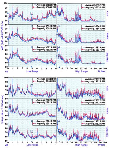 圖6顯示了3月25日在冷卻器4上收集的電機(jī)自由端數(shù)據(jù)。平均值+ Avg + sigma掩模(紅色)疊加用于比較。x軸以階數(shù)為單位進(jìn)行縮放,其中階數(shù)“1”表示電動(dòng)機(jī)的轉(zhuǎn)速。請(qǐng)注意軸向低范圍數(shù)據(jù)中突出的非同步峰值為4.9xM和7.1xM。這些峰值對(duì)應(yīng)于電機(jī)軸承的滾珠軸承通過(guò)頻率。在***范圍光譜中,諧波標(biāo)記被放置在諧波系列的每個(gè)峰上,間距為4.9xM。
