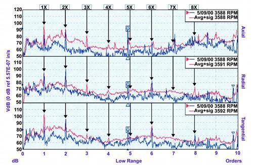 然后,計(jì)算平均加一西格瑪光譜掩模。據(jù)統(tǒng)計(jì),大約85%的振動(dòng)幅度應(yīng)低于平均值加上一個(gè)西格瑪面罩。與供應(yīng)商定義的通過(guò)/未通過(guò)標(biāo)準(zhǔn)或絕對(duì)標(biāo)準(zhǔn)(如IRD圖表)不同,相對(duì)標(biāo)準(zhǔn)允許機(jī)器本身定義可接受的內(nèi)容。圖3是在該案例歷史中使用的相對(duì)接受標(biāo)準(zhǔn)的一個(gè)軸的示例。圖4顯示了低和***范圍數(shù)據(jù)的所有三個(gè)軸的平均和平均加西格瑪水平。如果800線譜中的一個(gè)或多個(gè)峰超過(guò)平均加西格瑪振幅標(biāo)準(zhǔn),則僅這一事實(shí)并不表示存在嚴(yán)重問(wèn)題(參見(jiàn)診斷策略部分)。