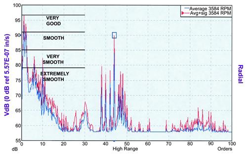 圖3.通過(guò)對(duì)來(lái)自12個(gè)相同冷卻器的光譜進(jìn)行平均,專門針對(duì)1,250噸冷水機(jī)生成相對(duì)驗(yàn)收標(biāo)準(zhǔn)。顯示的平均值(藍(lán)色底部光譜)和平均值加上一個(gè)標(biāo)準(zhǔn)偏差(紅??色頂部光譜)標(biāo)準(zhǔn)是徑向軸。IRD嚴(yán)重程度圖標(biāo)準(zhǔn)被疊加用于比較。