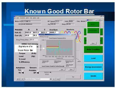 在另一項(xiàng)實(shí)驗(yàn)室控制的研究中,使用動(dòng)態(tài)測試儀徹底測試了在小型測力計(jì)上滿負(fù)荷運(yùn)行的1馬力電動(dòng)機(jī)。然后保存并分析結(jié)果。移除轉(zhuǎn)子,并通過一個(gè)轉(zhuǎn)子條鉆出一個(gè)5/8英寸的孔,將其完全切斷。電動(dòng)機(jī)在相同條件下組裝和重新測試。再次,保存結(jié)果,然后與原始數(shù)據(jù)進(jìn)行比較(圖4和5)。