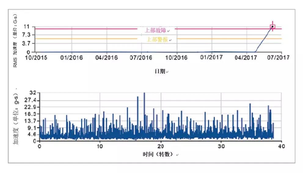 但這些沖擊是隨機(jī)的,有些可能會(huì)大到32 G-s。還請(qǐng)注意,在圖表中,沖擊突然開始達(dá)到***報(bào)警故障水平。這表明潤(rùn)滑不足。