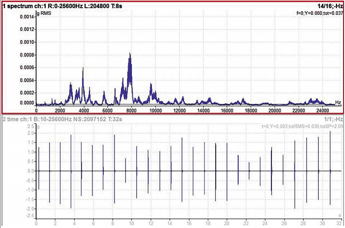 在圖1中,您可以看到頻譜和時(shí)間信號(hào)(在低速軸承上測(cè)量)。范圍是25 kHz。所有更***幅度的線都在2 kHz或更***的范圍內(nèi)。請(qǐng)注意頻譜中極低的g振幅。頻譜顯示信號(hào)的能量。在此信號(hào)中,我們只會(huì)看到?jīng)]有明顯能量的沖擊。這就是頻譜顯示極低值的原因。