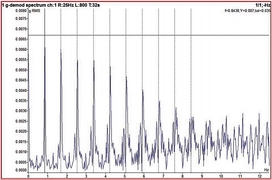 在圖2中,我們僅在25 Hz范圍內(nèi)測(cè)量了頻譜。該軸承的沖擊重復(fù)頻率約為1 Hz。在1 Hz附近看不到任何東西。如果要查看頻譜中的重復(fù)頻率,則必須應(yīng)用解調(diào)。這意味著,我必須補(bǔ)充精力。解調(diào)后的頻譜可以顯示可見的東西。解調(diào)頻譜使用包絡(luò)的時(shí)間信號(hào)。我們只想在500 Hz至25 kHz的頻段內(nèi)進(jìn)行測(cè)量。我們對(duì)低頻不感興趣。您可以想象包絡(luò)就像簡(jiǎn)單的電路:沖擊來(lái)了,給電容器充電,然后電容器通過(guò)電阻放電。放電時(shí)間比原始震動(dòng)的時(shí)間長(zhǎng)得多。這是在頻譜方面幫助我們的額外能量。確實(shí)有幫助。在第三張圖片中,您可以看到重復(fù)頻率0.85 Hz及其諧波。諧波總是會(huì)發(fā)生,因?yàn)榘j(luò)信號(hào)失真。這不是純正弦波,它只能顯示光譜中的一條線。我希望您在低速機(jī)器上進(jìn)行測(cè)量時(shí)會(huì)記得這篇文章,并希望您現(xiàn)在能夠更有效地檢查這些機(jī)器。
